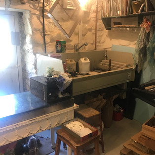 My aquatint box lurks next to the washing machine and the large sink with its heated vertical ferric etching tanks and central drained section for grinding the smaller litho stones is in the far corner by the hotplate. Worktops with stone storage beneath are planned, but have still to be built. So I'm working on a table and the surface of my potions storage dresser. This all came together in the autumn of 2018, when the floor was smoothed and painted, new doors were made and the walls and ceiling painted, then Giles from AMR Press came and assembled the various clanking heaps of cast iron into gleaming printing machines. It is so wonderful to have my own beautiful print workshop at last.